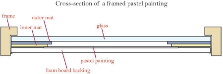The inner mat (spacer) is really important! It is cut with a larger opening (about 1/4″ larger on each side) to create a space around the edges of the painting that catches any pastel dust that falls. Paintings can be matted in elaborate ways – with 2 or more mats in different colors – but without this crucial inner layer, a pastel painting will eventually look bad. Even with fixative applied, over time some pastel dust will fall and make the beautiful mats dirty. Years back my mother framed some of her larger pastel pieces without any mat at all, and without a space to catch falling pastel dust, it has accumulated near the bottom of the paintings. It’s fixable with a new frame job, but could have been prevented. The diagram above illustrates the components of a properly framed pastel painting.