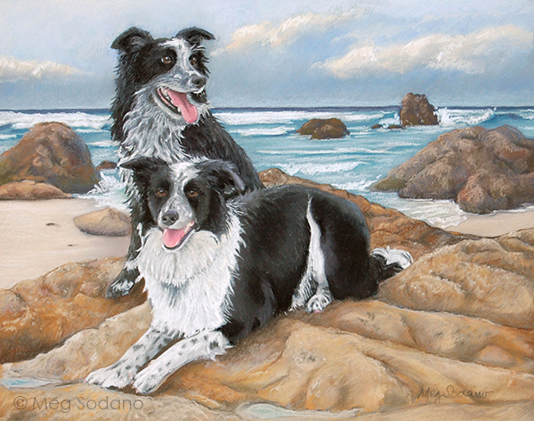 Anyone who knows and loves border collies will tell you how energetic and attentive they are, how their herding instincts direct every behavior. While Sam and Josey certainly possess strong border collie instincts, they have two very different, yet endearing personalities. Sam (sitting) is a very masculine dog, and his deliberate nature reflects his maturity. Josey (in front), highly intelligent and aware of the world around her, shows her free spirit when she barks at the moon or floating clouds.